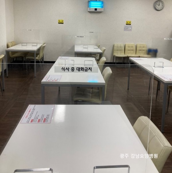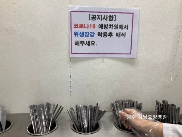 코로나19 2차 감염확산을 막기위해 직원식당 간이 칸막이 설치와 위생장갑착용 후 식기 만지기 시행을 모범적으로 잘 지키고 있어 소개할까 합니다. 직원식당입구에 손 소독제, 위생장갑을 상시 비치해 두어요. 식당출입전 손 소독을 하고 일회용 장갑을 착용해요. 일회용 장갑 착용 후 식기 및 모든 집기를 사용할 수 있어요. 6인용식탁은 간이 칸막이를 설치하여 2인만 앉아서 식사가능해요. 마스크는 식사시에만 벗을 수 있고 식사중 대화는 절대금지랍니다. 사회적거리두기 격상으로 요양병원 종사자의 방역수칙은 더욱 강화되어 있습니다. 강남요양병원은 고위험 시설인 만큼 의료진들과 종사자들은 더욱 더 방역수칙 준수와 코로나 감염확산 예방에 최선을 다 하겠습니다.