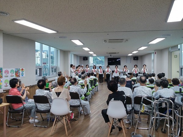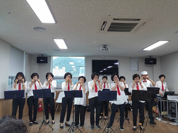 환자들의 여가생활을 위하여 다양한 악기로 즐거운 음악을 들려주시네요.