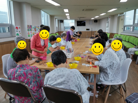 편마비가 있는 어르신 팔찌를 만들어 드리기 위해  열심히 핑크빛