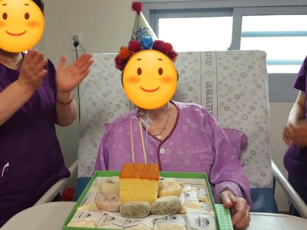 저희 강남요양병원에 입원중이신 어르신 가족분께서 생신 축하 떡 케이크를 보내주셨어요. 보내주신 케이크에 촛불도 꽂고 생신을 맞이하신 어르신 머리엔 고깔모자를 씌워드린 후 병동선생님들과 함께 생신축하송을 불러드렸어요. 갑작스럽 분위기에 당황하셨지만 매우 기뻐하셨어요. 진행하는 과정은 영상촬영 후 가족분에게 전송해 드렸어요.