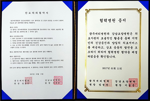 우리병원과 광주씨티병원간 "협력병원 협약"을 체결하였습니다.